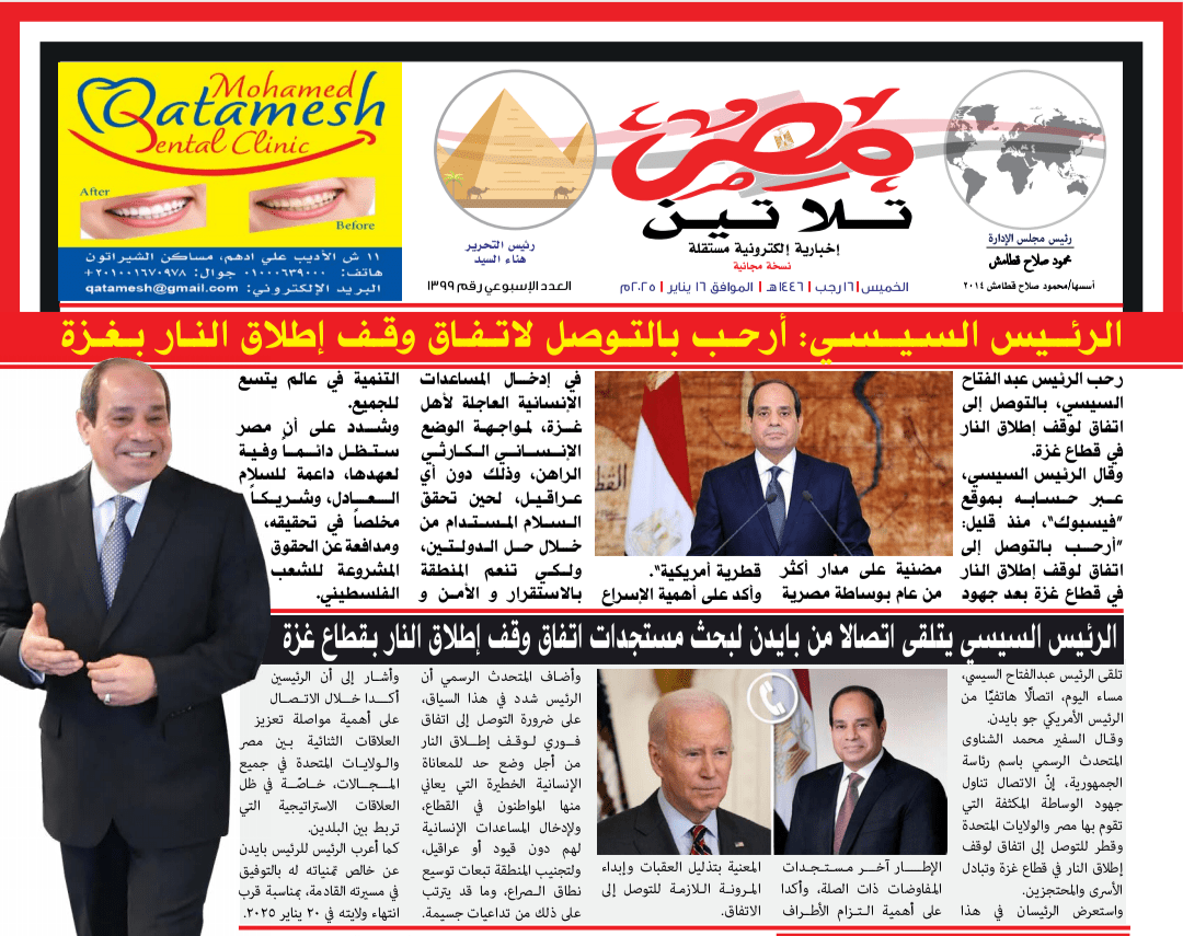 تقدم صحيفة مصر تلاتين عدد اسبوعي يصدر عن الصحيفة كل يوم خميس نستعرض فيه ونوثق أهم أحداث الاسبوع على المستوى المحلي والعالمي .