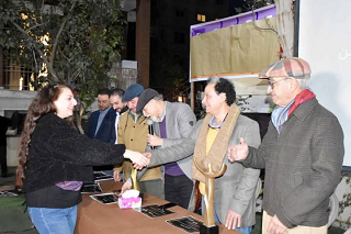 وشهد الحفل، الذي أقيم مساء امس السبت، حضور أعضاء لجنتي الفرز والتحكيم الفنان طارق الكومي نقيب التشكيليين، والدكتور سامي البلشي، والفنان وليد عبيد، والفنان حكيم جماعين، والفنان حسن داوود، والفنان عادل ثروت، والدكتور محمد هشام، وحضره المستشار الإعلامي لسفارة فلسطين في القاهرة ناجي الناجي.