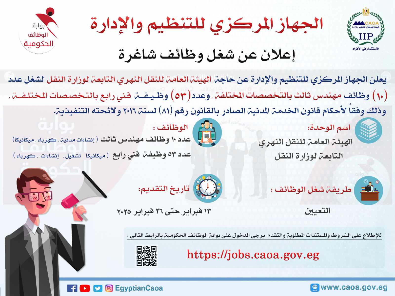 التنظيم والإدارة يعلن مسابقة لشغل 63 وظيفة بقطاع النقل النهري التابع للنقل