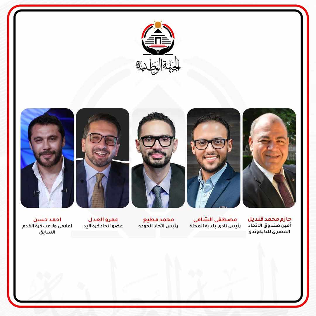 أعلن حزب الجبهة الوطنية تحت التأسيس، ضم مجموعة من الرموز الرياضية لعضويته،وهي: أحمد حسن الإعلامي ولاعب كرة القدم السابق ومحمد مطيع رئيس اتحاد الجودو والمهندس مصطفى الشامي رئيس نادى بلدية المحلة والدكتور عمرو العدل عضو اتحاد كرة اليد وحازم محمد قنديل أمين صندوق الاتحاد المصري للتايكوندو والمشرف علي منتخبات الباراتايكوندو وعضو الاتحاد الدولي للتايكوندو بلجنه الباراتايكوندو والمشرف علي الملف الإفريقي.
