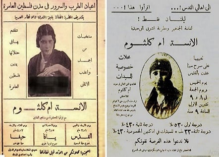 زارت أم كلثوم فلسطين لأول مرة عام 1928، حيث غنَّت فى مسرح «عدن» بالقدس أمام جمهور غفير، ثم توالت زياراتها بين 1931 و1935، وأحيت حفلات فى فلسطين وصفتها الصحف الفلسطينية حينها بأنها «زيارة تاريخية» اجتذبت جمهورها من المدن والقرى المجاورة.