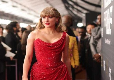 تايلور سويفت تشعل حفل جرامي بفستان أحمر لامع على السجادة الحمراء