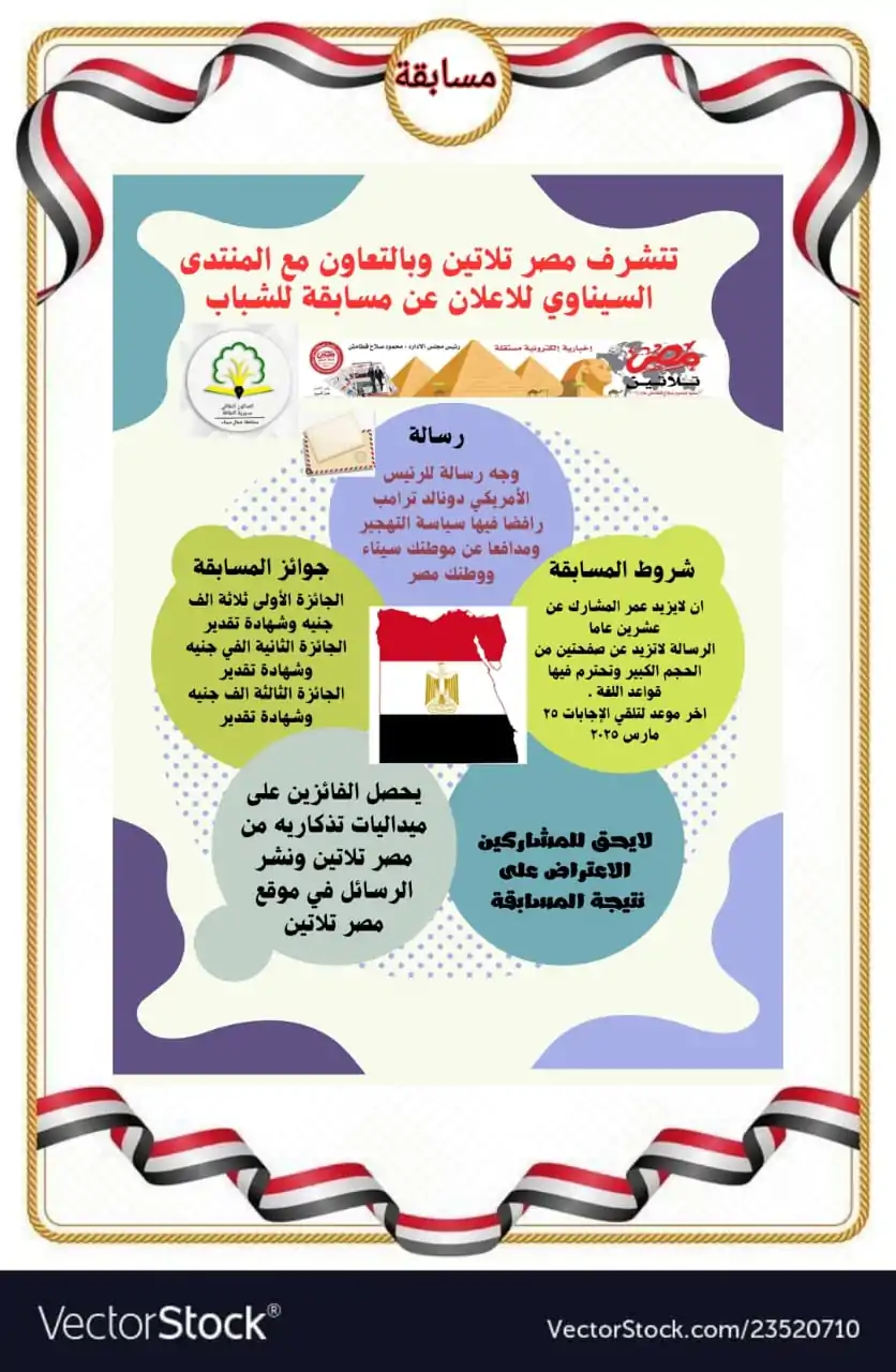 “مصر تلاتين والمنتدى الثقافي السيناوي يعلنان عن مسابقة أدبية للشباب: اكتب رسالة إلى الرئيس الأمريكي ترامب دفاعًا عن سيناء ومصر ضد مخططات التوطين والتهجير”