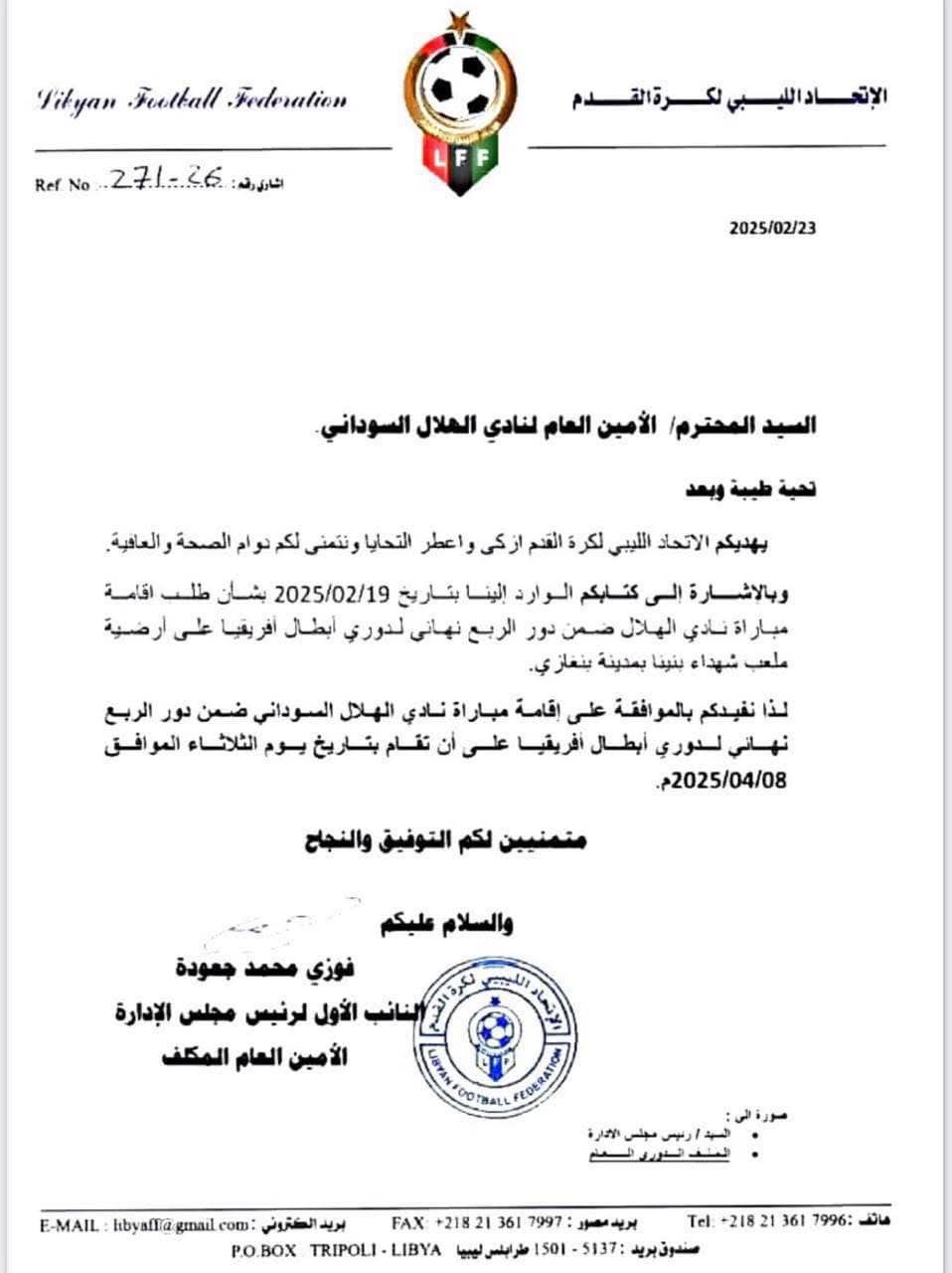 أعلن الاتحاد الليبي لكرة القدم على موافقته على استضافة مباراة فريق الهلال السوداني والأهلي في إياب ربع نهائي دوري أبطال إفريقيا والمقرر لها 8 أبريل المقبل.