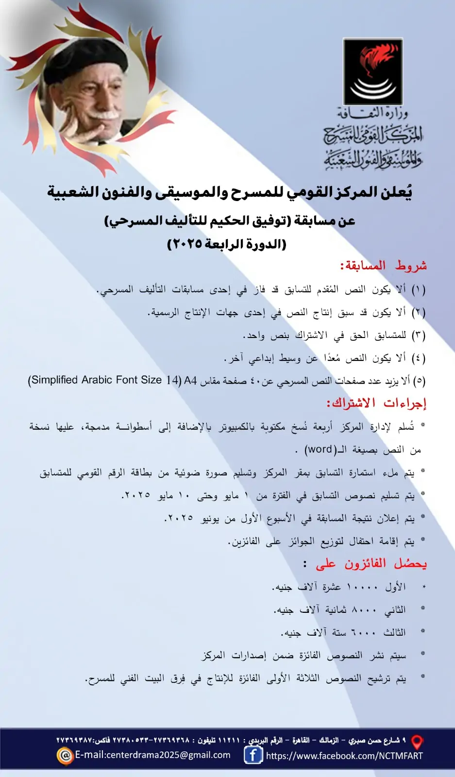 أول مايو.. بدء التقديم لمسابقة “توفيق الحكيم للتأليف المسرحي” بـ”القومي للمسرح والموسيقى والفنون الشعبية”