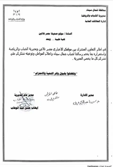 مديرية الشباب والرياضة بالعريش توجه خطاب شكر لـ”مصر تلاتين” تقديرًا للتغطية الإخبارية المتميزة