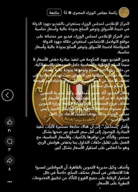 نشر المركز الإعلامي لمجلس الوزراء، فيديو عبر منصاته على مواقع التواصل الاجتماعي، استعرض خلاله جهود الدولة المتواصلة لضبط الأسواق وتوفير السلع بجودة عالية وأسعار مناسبة.