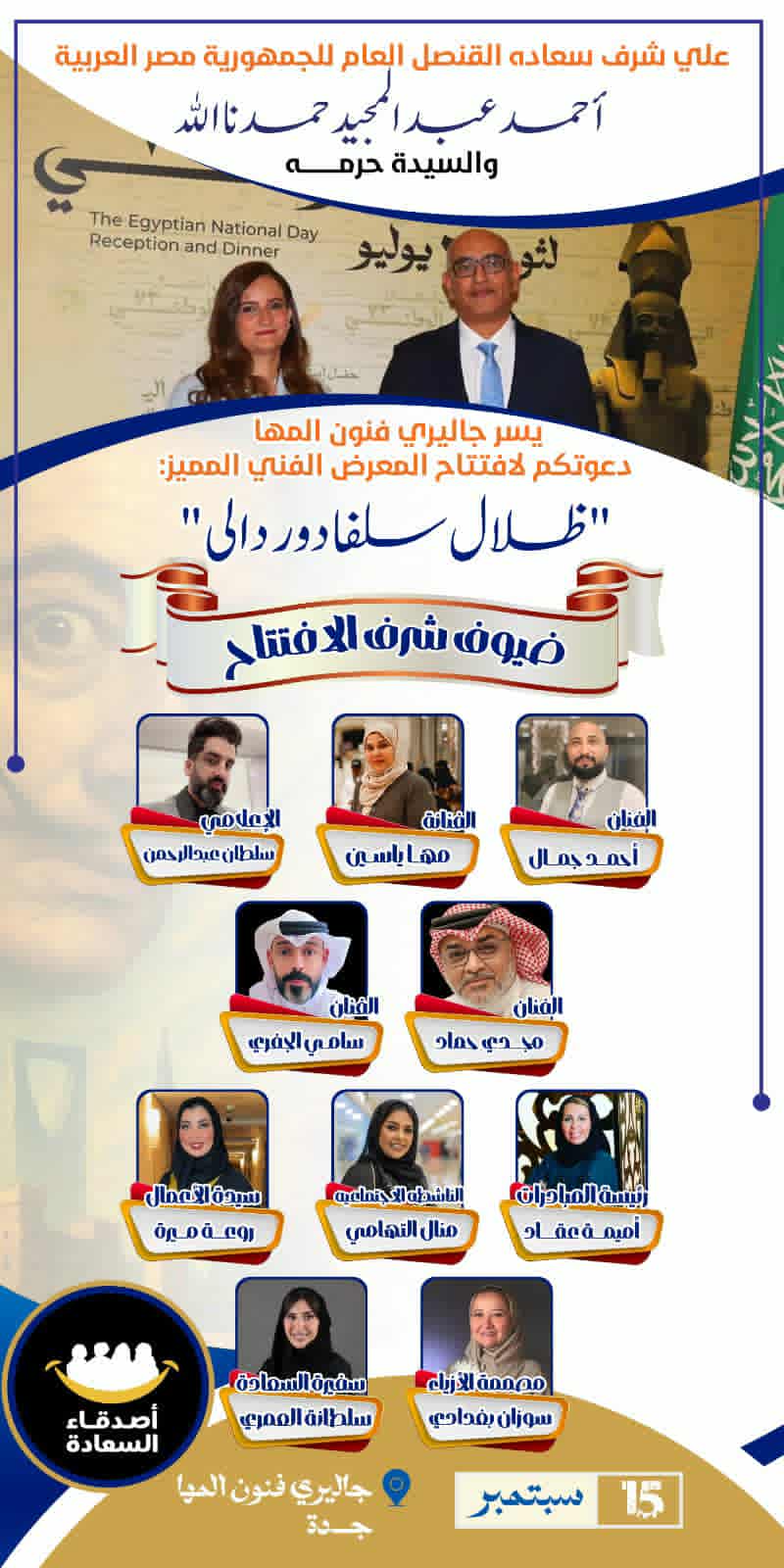يفتتح فريق أصدقاء السعادة معرض “ظلال سلفادور دالى” بجاليري فنون المها، على شرف سعادة القنصل العام للجمهورية مصر العربية أحمد عبدالمجيد حمدنا الله، والسيدة حرمه. وقد شرف الحفل حضور العديد من الشخصيات المرموقة، منهم الفنانة التشكيلية مها ياسين، وفريق أصدقاء السعادة مؤسسة مبادرات أميمة عقاد، والناشطة الاجتماعية منال التهامي، وسيدات الأعمال روعة ميرة، ومصممة الأزياء سوزان بغدادي، وسفيرة السعادة سلطانة العمري، والإعلامي عبدالله طلال شافعي، ومجموعة من الفنانين المتميزين.