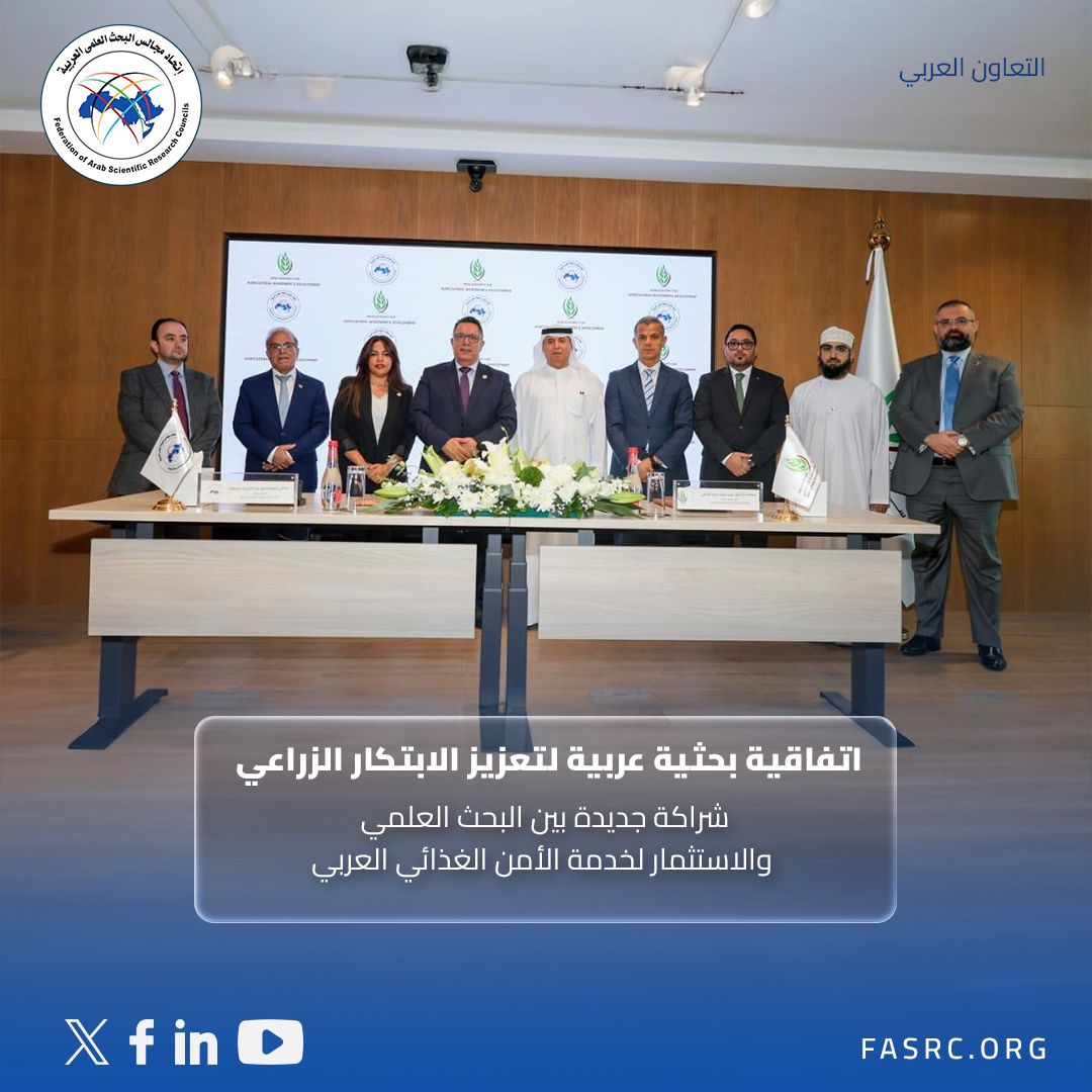 ضمن جهود الاتحاد لتعزيز التعاون في مجالات البحث العلمي والتطوير الزراعي، ودعم الأمن الغذائي العربي والتنمية المستدامة، وقع اتحاد مجالس البحث العلمي العربية مذكرة تفاهم مع الهيئة العربية للاستثمار والإنماء الزراعي.