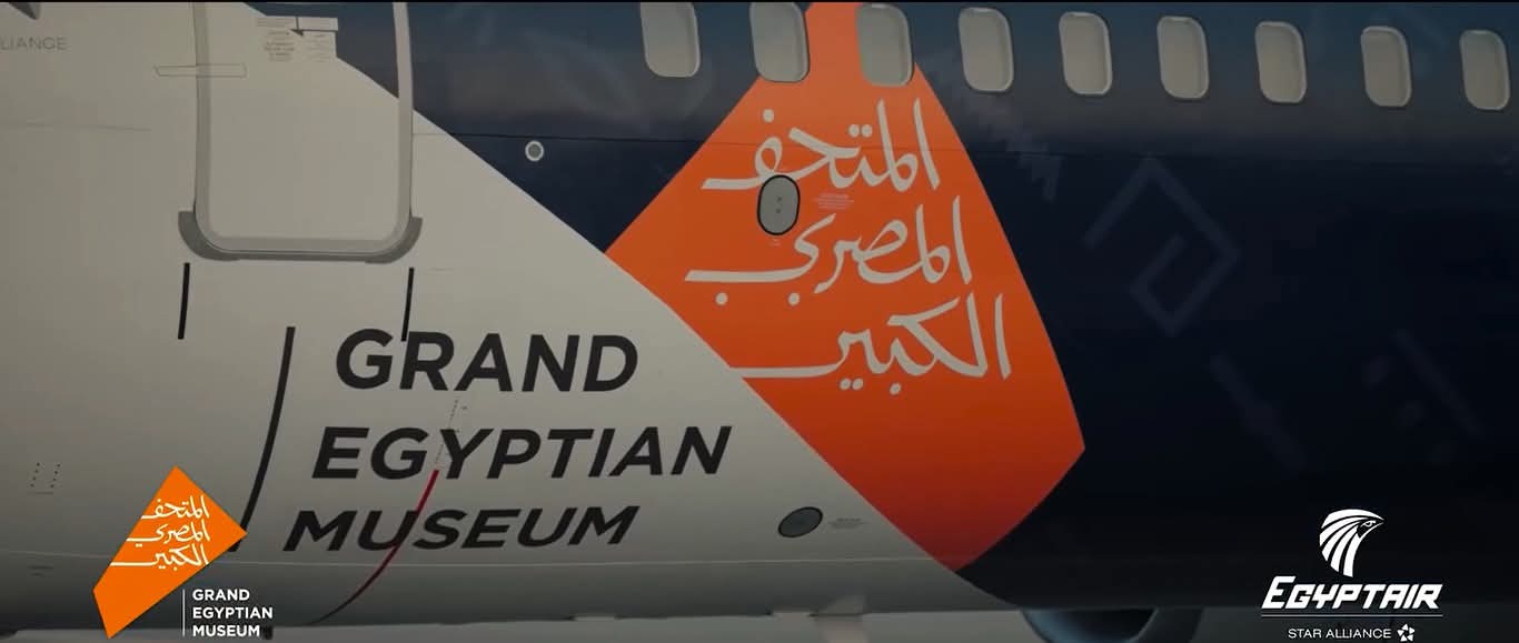 مصر للطيران الناقل الوطنى ا تحلق بطائرة مزينه بالكامل بشعار المتحف المصرى الكبير