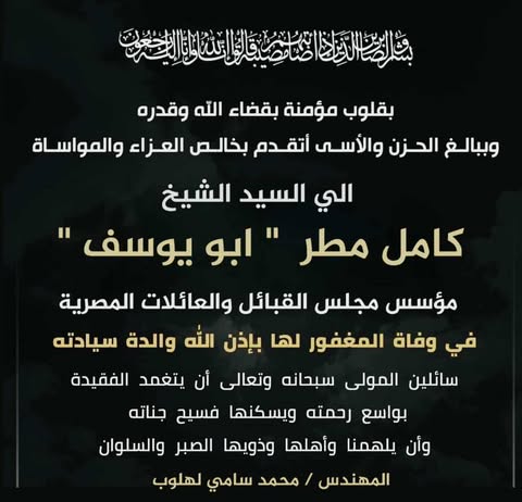 بقلوب مؤمنة بقضاء اللّه وقدره وببالغ الحزن والآسى أتقدم بخالص العزاء والمواساة إلى السيد الشيخ كامل مطر “أبو يوسف” مؤسس مجلس القبائل والعائلات المصرية، في وفاة المغفور لها بإذن اللّٰه والدة سيادته، سائلين المولى سبحانه وتعالى أن يتغمد الفقيدة بواسع رحمته ويسكنها فسيح جناته وأن يلهمنا وأهلها وذويها الصبر والسلوان.