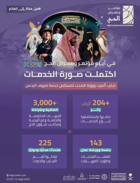 وسط حضور لافت، اختتمت جدة مؤتمر ومعرض الحج 2025، الذي أُقيم في أكبر قبة للمعارض في العالم ‘سوبردوم جدة’ خلال الفترة من 9 إلى 12 نوفمبر 2025 بمشاركة نخبة من الجهات المعنية بتطوير منظومة الحج والعمرة و الخدمات اللوجستية الداعمة لها تحقيقاً للرؤية 2030.