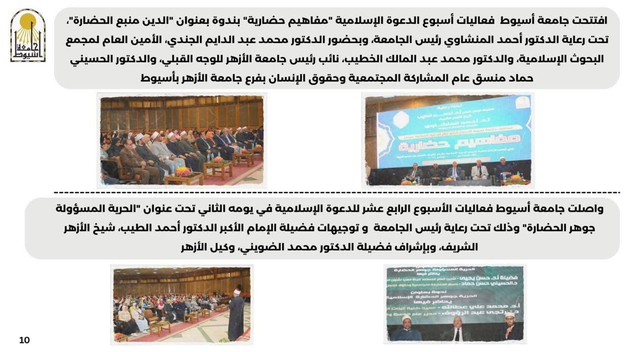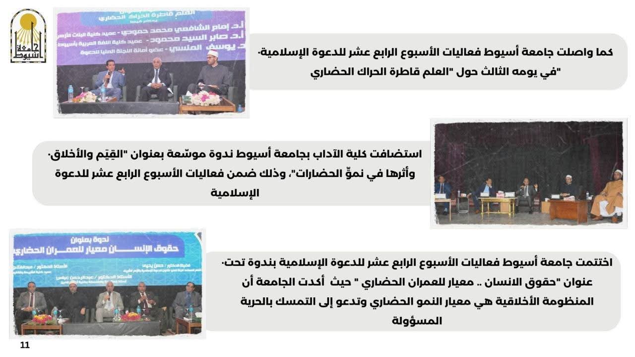 • استضافت كلية الآداب بجامعة أسيوط ندوة بعنوان “القِيَم والأخلاق وأثرها في نموِّ الحضارات”، وذلك ضمن فعاليات الأسبوع الرابع عشر للدعوة الإسلامية