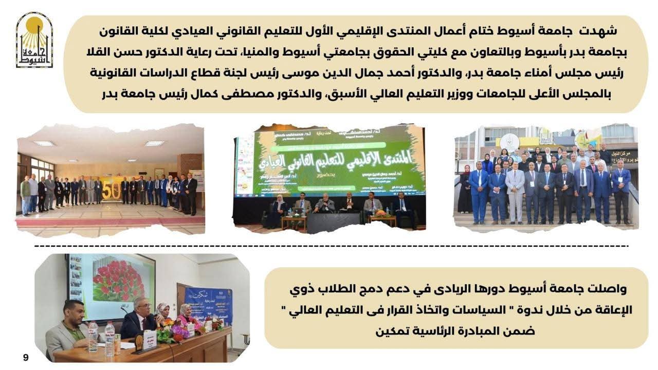 • شهدت جامعة أسيوط ختام أعمال المنتدى الإقليمي الأول للتعليم القانوني العيادي لكلية القانون بجامعة بدر بأسيوط وبالتعاون مع كليتي الحقوق بجامعتي أسيوط والمنيا، تحت رعاية الدكتور أحمد المنشاوي رئيس جامعة أسيوط، والدكتور حسن القلا رئيس مجلس أمناء جامعة بدر، والدكتور أحمد جمال الدين موسى رئيس لجنة قطاع الدراسات القانونية بالمجلس الأعلى للجامعات ووزير التعليم العالي الأسبق، والدكتور مصطفى كمال رئيس جامعة بدر.