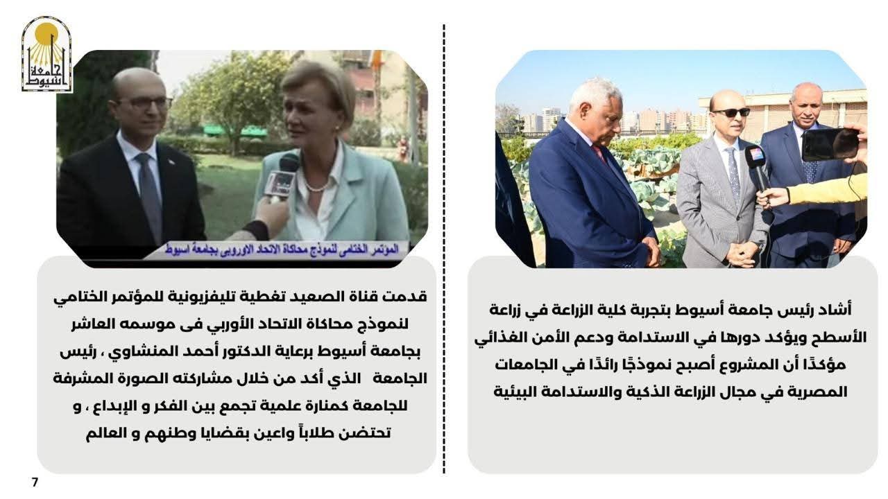 • قدمت قناة الصعيد تغطية تليفزيونية للمؤتمر الختامي لنموذج محاكاة الاتحاد الأوربي فى موسمه العاشر بجامعة أسيوط برعاية الدكتور أحمد المنشاوي، الذي أكد من خلال مشاركته الصورة المشرّفة للجامعة كمنارة علمية تجمع بين الفكر والإبداع، وتحتضن طلابًا واعين بقضايا وطنهم والعالم.
