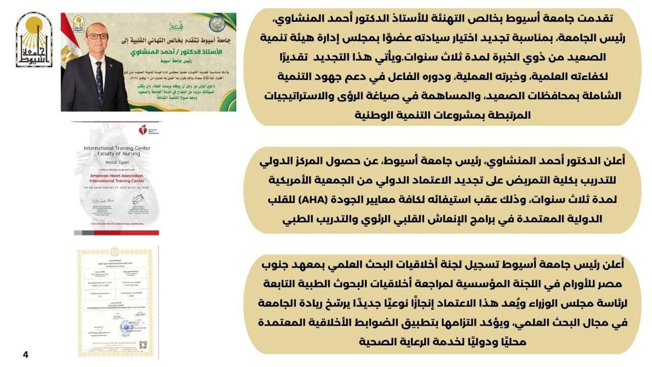 • تقدمت جامعة أسيوط بخالص التهنئة للأستاذ الدكتور أحمد المنشاوي، رئيس الجامعة، بمناسبة تجديد اختيار سيادته عضوًا بمجلس إدارة هيئة تنمية الصعيد من ذوي الخبرة، اعتبارًا من ٦ نوفمبر ٢٠٢٥ ولمدة ثلاث سنوات.ويأتي تجديد اختيار الأستاذ الدكتور أحمد المنشاوي تقديرًا لكفاءته العلمية، وخبرته العملية، ودوره الفاعل في دعم جهود التنمية الشاملة بمحافظات الصعيد، والمساهمة في صياغة الرؤى والاستراتيجيات المرتبطة بمشروعات التنمية الوطنية.