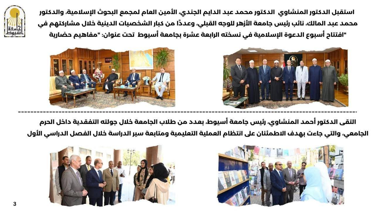 استقبل الدكتور أحمد المنشاوي رئيس جامعة أسيوط، كلًّا من الدكتور محمد عبد الدايم الجندي الأمين العام لمجمع البحوث الإسلامية، والدكتور محمد عبد المالك نائب رئيس جامعة الأزهر للوجه القبلي، وعددًا من كبار الشخصيات الدينية، خلال مشاركتهم في فعاليات أسبوع الدعوة الإسلامية في نسخته الرابعة عشرة المنعقد في جامعة أسيوط هذا العام تحت عنوان: “مفاهيم حضارية”.