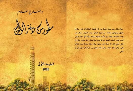 د. صلاح سلام أشكر كل من هنأني والحمد لله على هذا العمل الذي أعتبره وثيقة وطنية مهمة الكتاب صدر عن الهيئة المصرية العامة للكتاب وأنا دائمًا أحرص على أن تكون مؤلفاتي صادرة عنها لأن كتبي تتضمن جانبًا وطنيًا أو سير أبطال أو أحداثًا وقعت في سيناء وهذا يستلزم مراجعة دقيقة من الشؤون المعنوية للقوات المسلحة وهي خطوة تجعل العمل معتمدًا وموثقًا