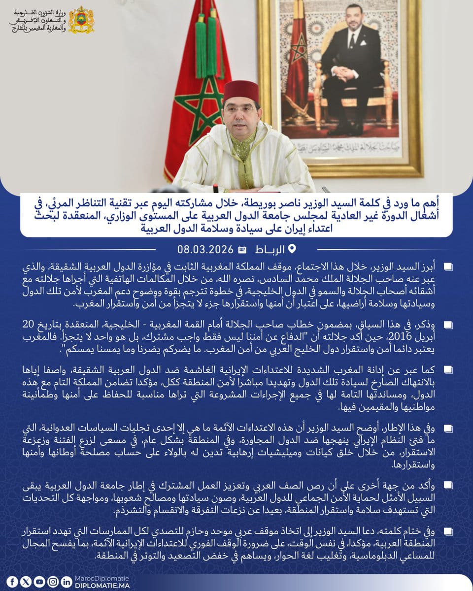 جاء هذا الموقف في كلمة السيد بوريطة، في أشغال اجتماع الدورة غير العادية لمجلس جامعة الدول العربية على المستوى الوزاري، الذي خصص لبحث اعتداء إيران على سيادة وسلامة الدول العربية.