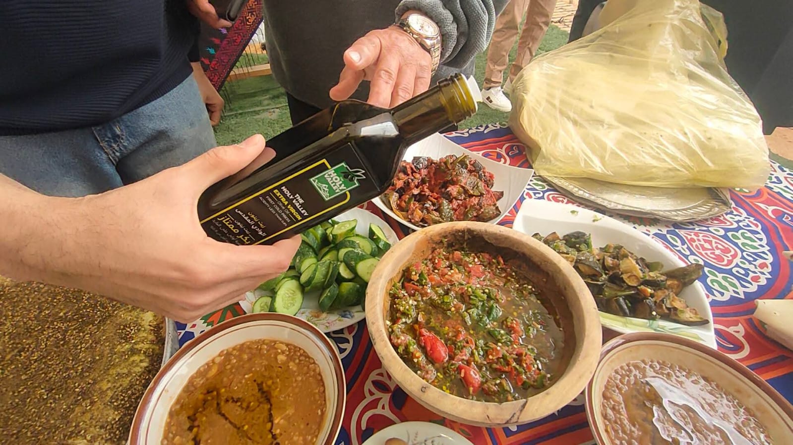 وأكد ايمن مرتضى وكيل وزارة التضامن الاجتماعي بشمال سيناء وقال نثمن الجهود المبذولة من قبل السيدات والفتيات المنتجات اليدوية والتراثية ونسعى بكل الجهود الجادة لمشاركتهم فى كافة المعارض لإبراز الدور السيناوى للسيدات المنتجات واختتم الاحتفال بوليمة من الافطار السيناوى المتميز من كافة منتجات الطبيعة السيناوية والتى اعتادات مني جمعه مدير مركز إعداد أول بالتضامن الاجتماعي تحت اشراف جمعيه التدريب المهني والأسر المنتجة بعمل الولائم السيناوية فى المحافل والاعياد تحت اشرافها بايدى المتطوعين من فطير الصاج المعمول على نار الحطب وهو من اشهى انواع الخبز العرايشى المتميز بالطعم ورائحة الشواء وسلطة العجر المشوى على نار الحطب والتى يصنع منها وجبة اللصيمة المشهورة فى المجتمع السيناوى وهى من الاكلات الشعبية التى تنال اعجاب البعض من الزائرين للمحافظة بالاضافة الى سلطة البزنجان والفول المدمس والعدس المدمس والمصقعة والمش العرايشى والزعتر السيناوى والبطاطس المحمرة اشاد جميع الحضور بهذة الاحتفاليه المتميزة و الوليمة النى كانت مفاجاة للجميع شارك بها العديد من متطوعى الهلال الاحمر السيناوى .