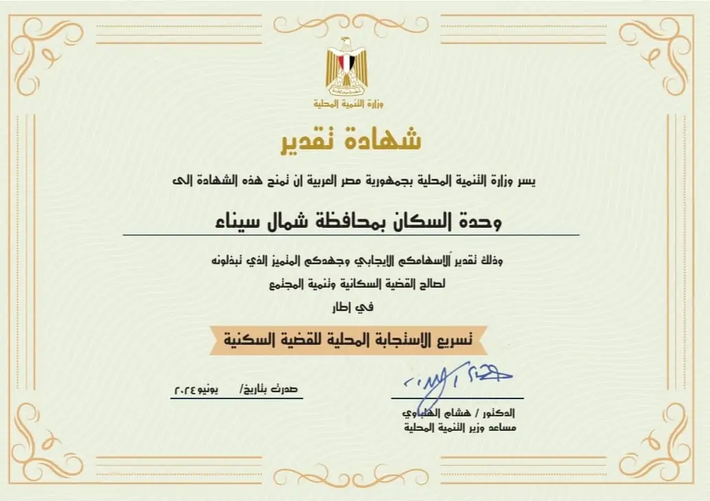 وحدة السكان بمحافظة شمال سيناء تحصل على شهادة تقدير من وزارة التنمية المحلية لجهودها فى حل القضية السكانية