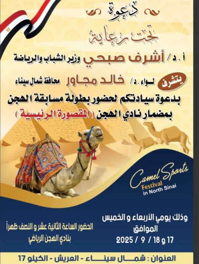 برعاية وزير الشباب والرياضة ومحافظ شمال سيناء… انطلاق بطولة الهجن بنادي الهجن الرياضي بالعريش